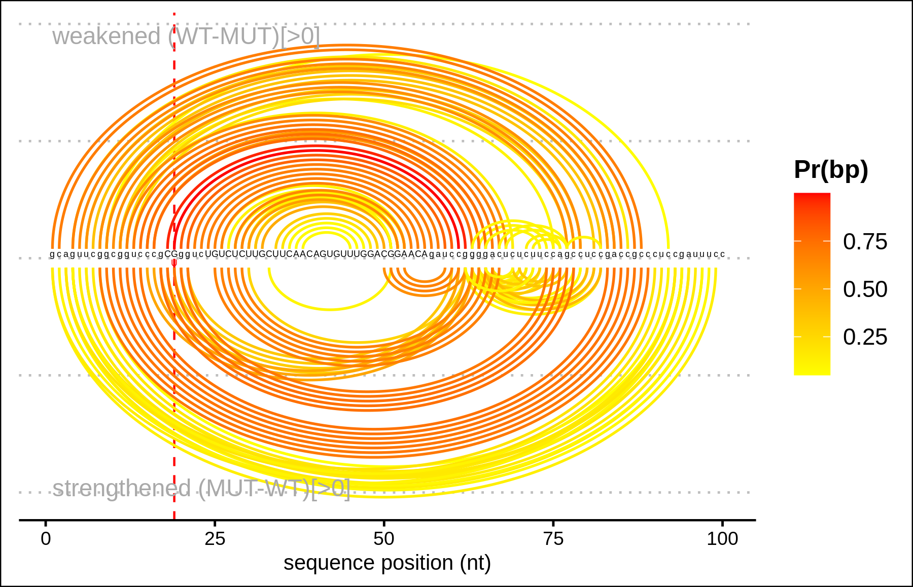 Arc plot representations (top) of the absolute change of base pairing probabilities